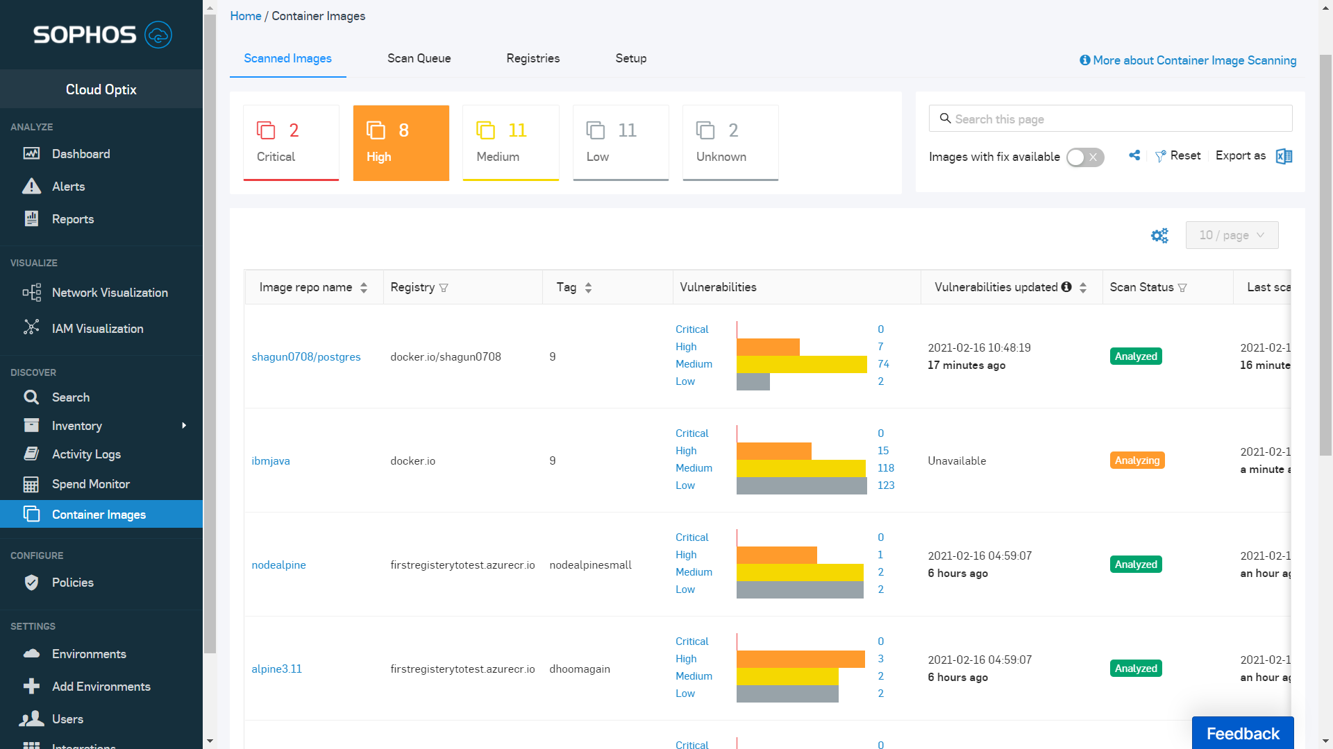 Cloud Optix, the Sophos Cloud Security Posture Management service, helps prevent security breaches by providing both visibility of container assets and scanning to identify exploitable weak points in container images.