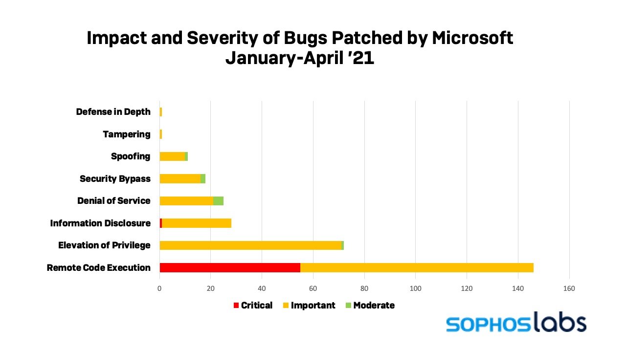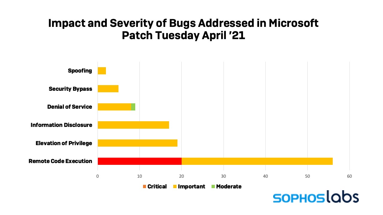 All 20 of the bugs rated as critical to patch by Microsoft in April were remote code execution bugs. A total of 87 were rated as important, and only one was given moderate importance: CVE-2021-28312, a Windows NTFS denial of service vulnerability that is less likely to be exploited.