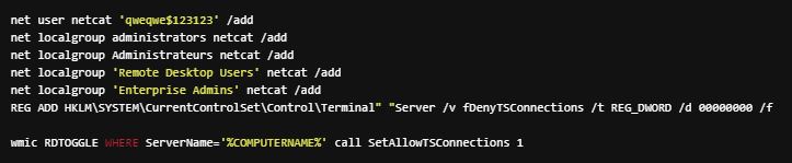 We also witnessed an attempted file-less attack, in which the Lemon Duck actor sent commands identical to the code used in script-based exploits to be directly executed by the Windows command-line interface (cmd.exe), attempting to create a user and gain Remote Desktop access to the targeted servers. The username and password used in these commands were identical to those used in the certutil-based attacks. This and other factors lead us to believe that these attacks were executed by the same threat actor.