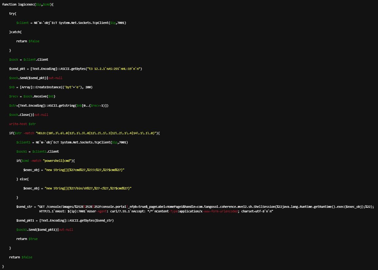 The attack exploits CVE-2020-14882, a remote code execution vulnerability, to download and execute a malicious script on vulnerable WebLogic servers. Both Windows and Linux platforms are targeted by this threat actor, using exploits crafted for each.