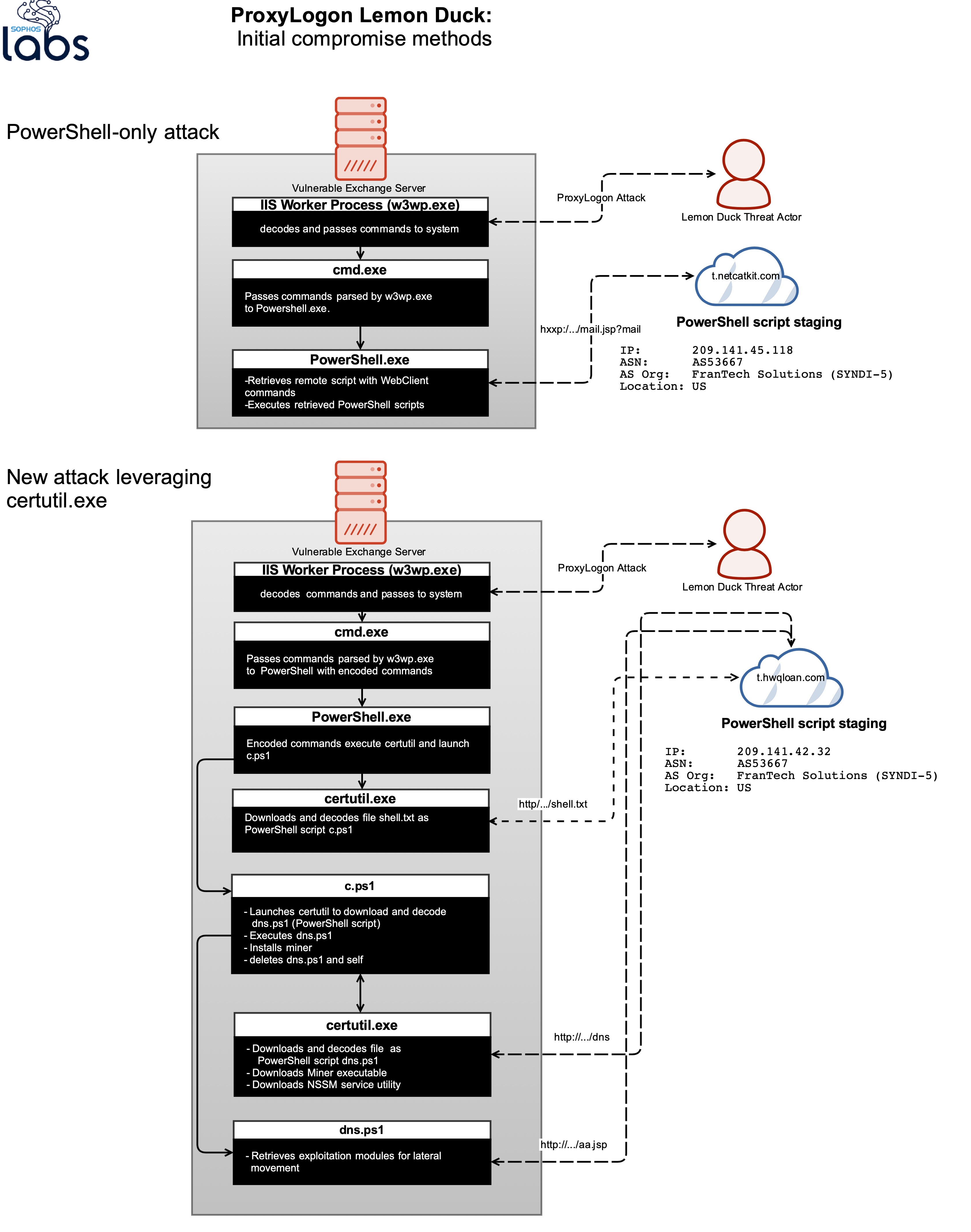 Recently, we discovered that ProxyLogon has been added to an update to Lemon Duck, an advanced crypto miner malware. While many of these attacks follow a familiar approach already documented by researchers, we discovered variants of Lemon Duck attacks that use a collection of new approaches in their attempts to compromise vulnerable Exchange Server instances. Because of commonalities across all of these variants, we believe they are part of the same Lemon Duck campaign,