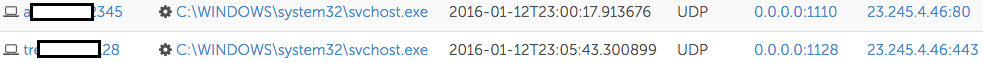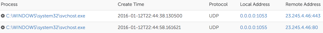 CTU researchers reviewed the network connections established by the processes involved in running the malware. The PlugX backdoor attempted to connect to IP address 23.245.4.46 on port 443 (see Figure 6).