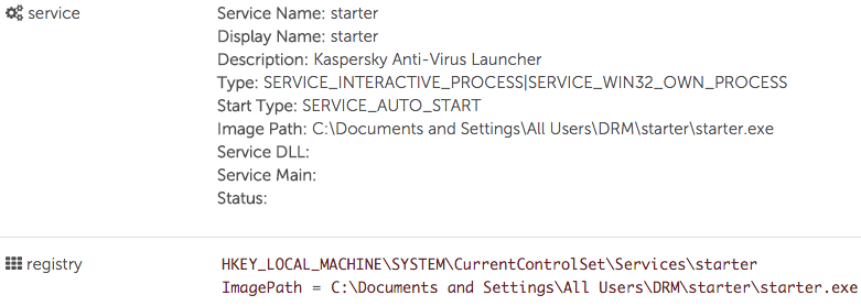 After identifying the installation method and payload, CTU researchers investigated the persistence mechanism used by the malware on the Windows XP system. The legitimate signed Kaspersky binary persisted as a Windows service and was set to start every time the system was booted (see Figure 5).