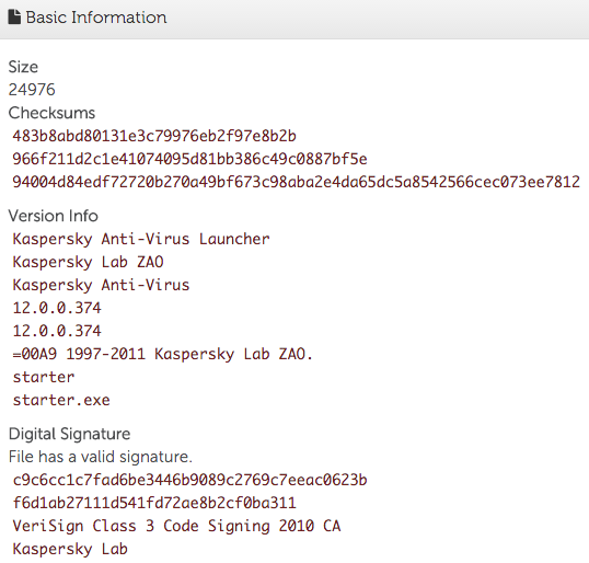 The suspicious starter.exe process running out of the %ALLUSERSPROFILE% directory started the process that contained the PlugX code. Basic information about starter.exe indicated that it contained a valid digital signature and was part of Kaspersky’s antivirus software (see Figure 3). The threat actors likely selected Kaspersky antivirus software because signed security software would be ignored during an investigation. They did not attempt to blend in by using software native to the environment, as the victim used a different antivirus solution. The technique of running a legitimate, typically digitally signed, program and replacing one of its legitimate DLLs with a malicious one that loads shell code is referred to as “DLL side loading.” That malicious shellcode payload is often injected into a legitimate Windows process like svchost.exe, msiexec.exe, or explorer.exe.