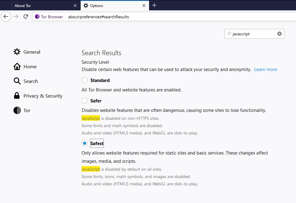 Tor’s ‘standard’ setting enabled JavaScript by default, which users can upgrade to either ‘safer’, which disables JavaScript on non-HTTPS sites, or ‘safest’, which disables JavaScript completely.