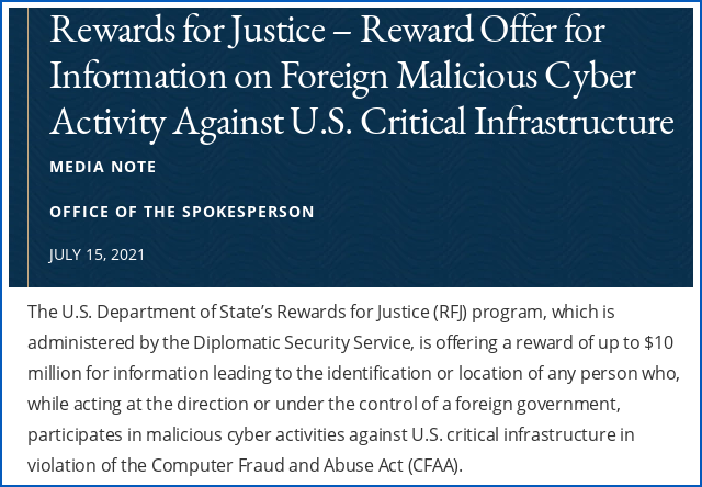 The U.S. Department of State’s Rewards for Justice (RFJ) program, which is administered by the Diplomatic Security Service, is offering a reward of up to $10 million for information leading to the identification or location of any person who, while acting at the direction or under the control of a foreign government, participates in malicious cyber activities against U.S. critical infrastructure in violation of the Computer Fraud and Abuse Act (CFAA).