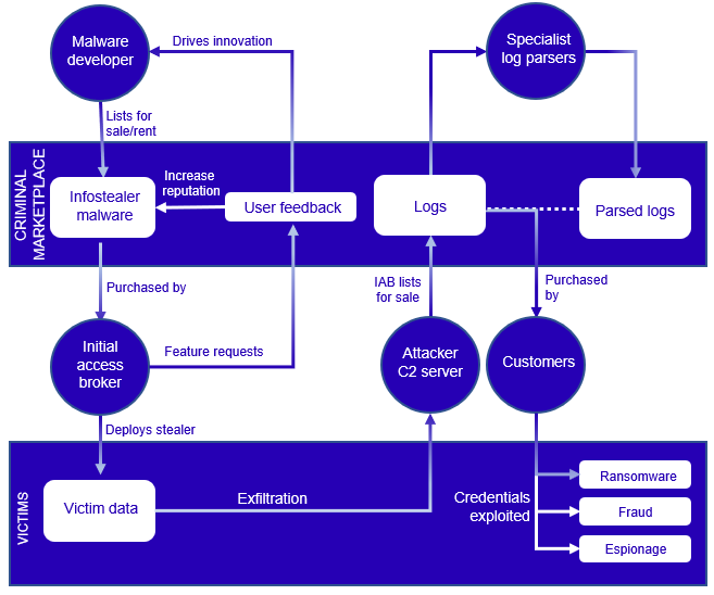 Figure 11. An overview of roles and relationships in the infostealer ecosystem. (Source: Secureworks)