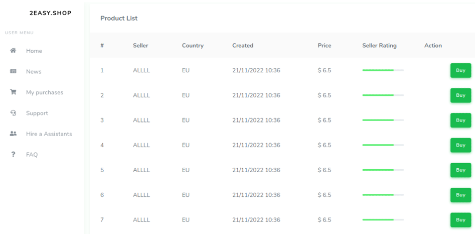 The 2easy marketplace has rapidly grown since it was established in 2018. Like Genesis Market, 2easy is automated, allowing buyers to add money to wallets and purchase logs without directly interacting with the seller. Unlike other sites, 2easy does not provide samples or previews. However, logs are reportedly less expensive than those on Genesis Market and Russian Market.