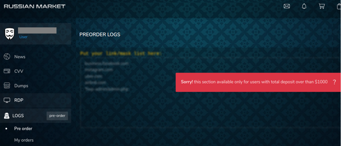 In October 2022, Russian Market changed its operating model to allow users to preorder credentials (see Figure 1). This feature requires that buyers deposit $1,000 USD into the site's escrow system. Buyers can then request credentials based on a domain name (from a specific organization) or a 'mask' (from a specific application). Although there are no guarantees that preorders will be fulfilled, this feature could lead to specific targeting of organizations and sectors rather than relying just on opportunistic attacks.