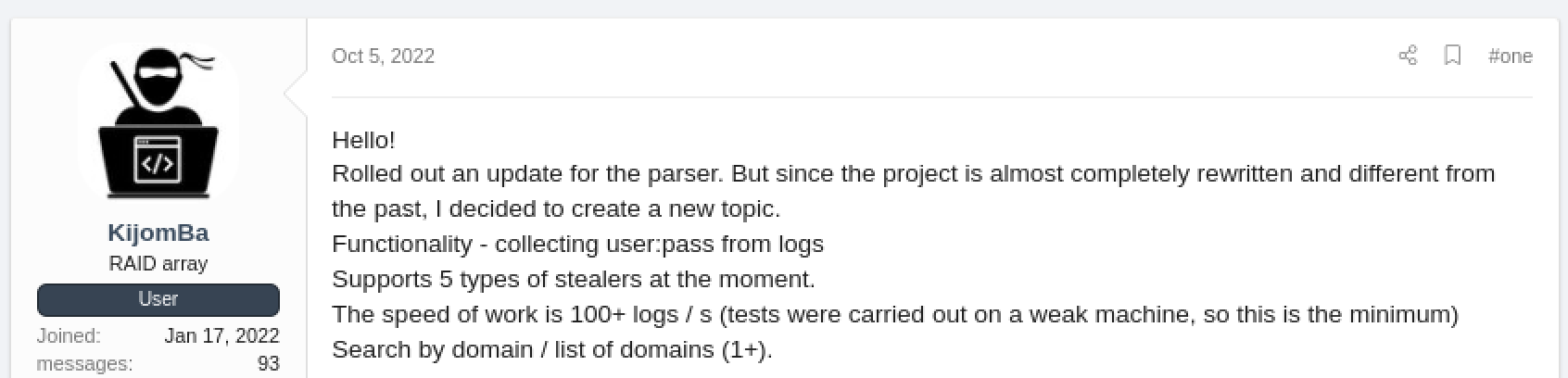 Figure 13. Threat actor selling a parser for large batches of stealer logs. (Source: Secureworks)