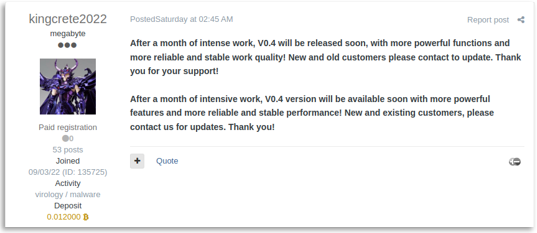 Figure 9. Forum post announcing Rhadamanthys updates. (Source: Secureworks)