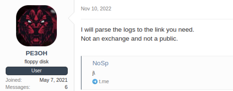 Stealer logs are available from underground forums, marketplaces, and other online platforms that cater to threat actors interested in obtaining credentials, financial information, personal data, banking details, cryptocurrency wallets, and other sensitive, secret, or valuable information. These marketplaces are often only accessible through Tor or the Invisible Internet Project (I2P) anonymity services and usually have strict rules and regulations regarding the types of information that can be traded. The offerings are typically only accessible to members who have been approved by the marketplace's administrators or who pay an entry fee. Some marketplaces only sell infostealer logs and have built their infrastructure to facilitate these transactions. Other forums offer many illicit wares for sale and have sections that include logs obtained from infostealers.