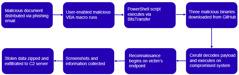 Taurus was predominantly distributed via spam emails containing a malicious attachment. Opening the attached document prompts the victim to enable macros, which then executes a PowerShell script that initiates the download of additional payloads. Stolen data is exfiltrated as a ZIP file to a C2 server whose URL is built at runtime. Figure 8 shows the infection process.