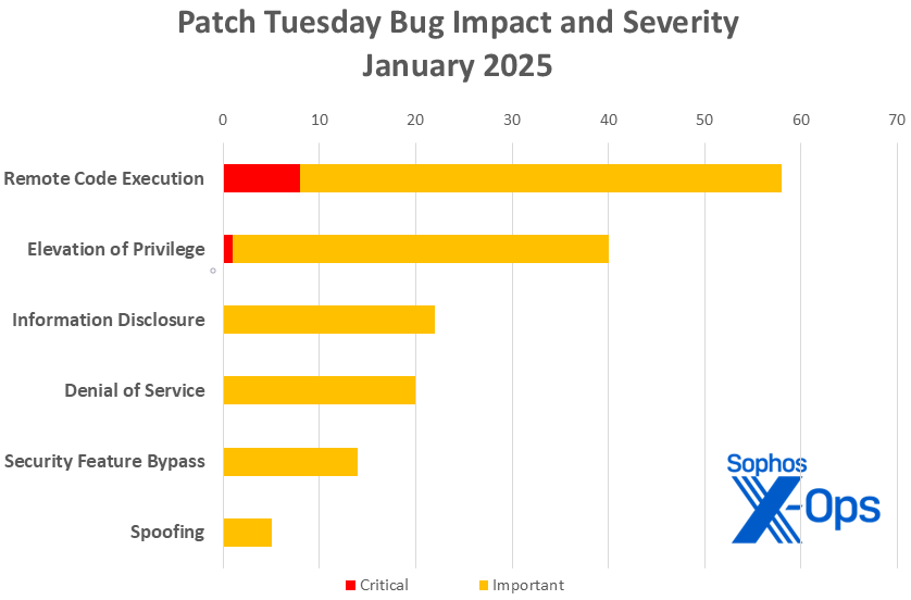 A bar chart showing the distribution of severities of bugs patched in the January 2025 Patch Tuesday set, as described in the article text