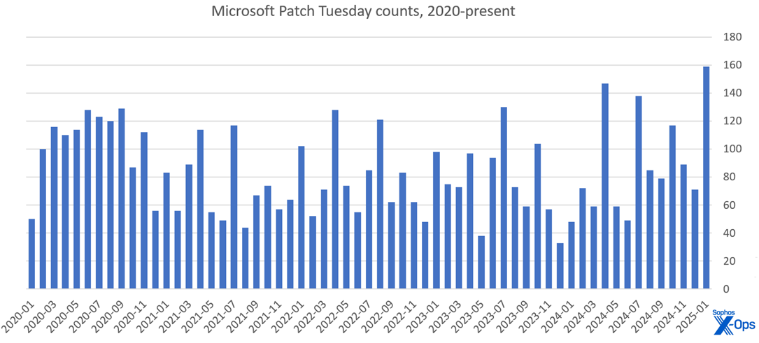 A bar chart showing 61 months of overall CVEs counts for Microsoft Patch Tuesdays since January 2020; the rightmost bar indicates the numbers for january 2025 and is taller than the rest