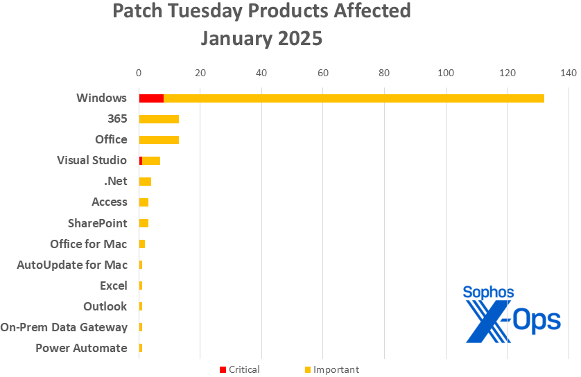 A bar chart showing the distribution of product families affected by bugs patched in the January 2025 Patch Tuesday set, as described in the article text