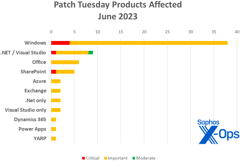 We are including at the end of this post three appendices listing all Microsoft’s patches, sorted by severity, by predicted exploitability, and by product family. As per Microsoft’s guidance we’ll treat the three Edge patches (CVE-2023-29345, CVE-2023-33143, CVE-2023-33145) with Microsoft-assigned CVE numbers as information-only; they are not included in any of the totals or charts that follow.
