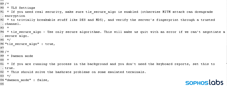 Among the files contained in the QuickCPU.dat archive are the configurator for the miner, which appears to be xmr-stak. By default, the payload sets up the miner so that it only can communicate if it can have a secure TLS connection back to the Monero wallet where it will store its value. If the miner detects that there’s a certificate mismatch (or some other indication of a TLS MITM), it quits and attempts to reconnect every 30 seconds.