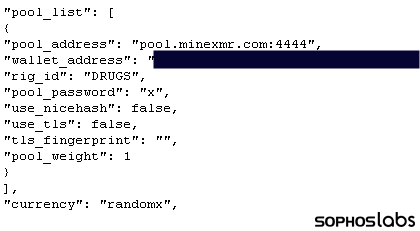 The miner’s pools.txt file is also temporarily written to disk, which reveals not only the wallet address and its password, but also that the name the attacker has given to this pool of miners: DRUGS. The “currency”: “randomx” in this file appears to be a configuration specific to the xmr-stak miner.