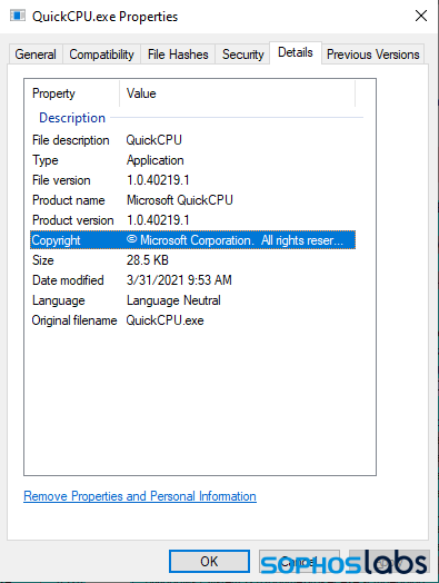 When decoded, the batch script runs the executable, which extracts the miner and configuration data from the QuickCPU.dat file, injects it into a system process, and then deletes the evidence. The file uses forged data in its Properties sheet that indicates the file is a Windows component, but the binary is not digitally signed and besides, no such file has ever existed as a standard component of Windows, though there is a legitimate utility with the same name, made by a third-party software developer. That utility is not connected to this malware in any way.