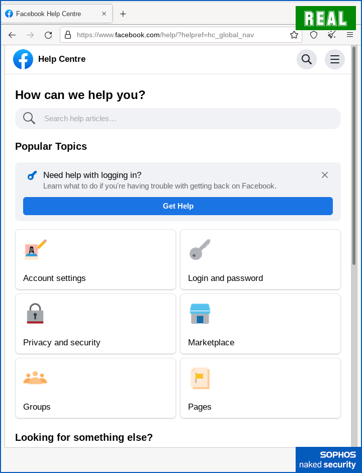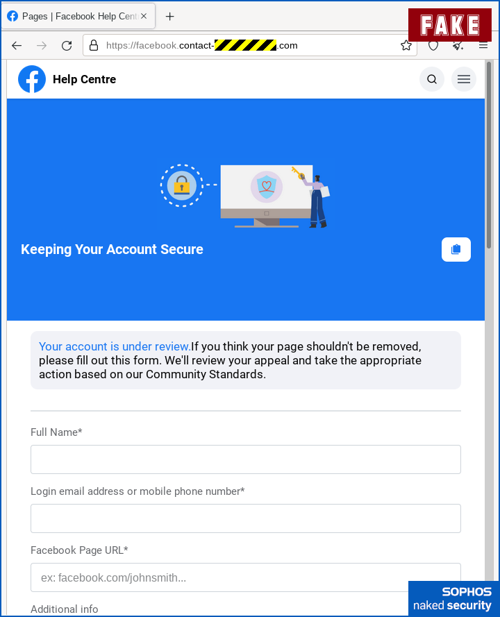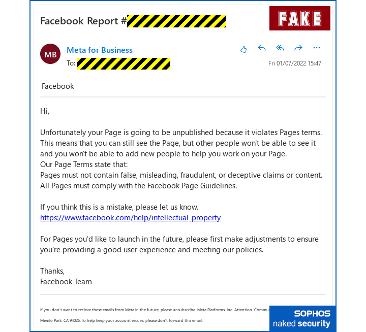Finally, in another common trick these days, the criminals soften the dismount, as it were, by casually redirecting you to a legitimate Faceook page at the end.