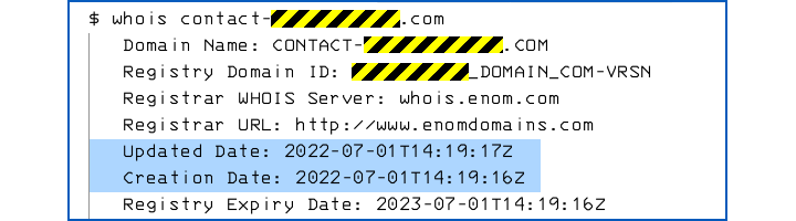 At 19 minutes after 3 o’clock UK time today [2022-07-01T14:19:00.00Z], the criminals behind this scam registered a generic and unexceptionable domain name of the form contact-XXXXX.com, where XXXXX was a random-looking string of digits, looking like a sequence number or a server ID: