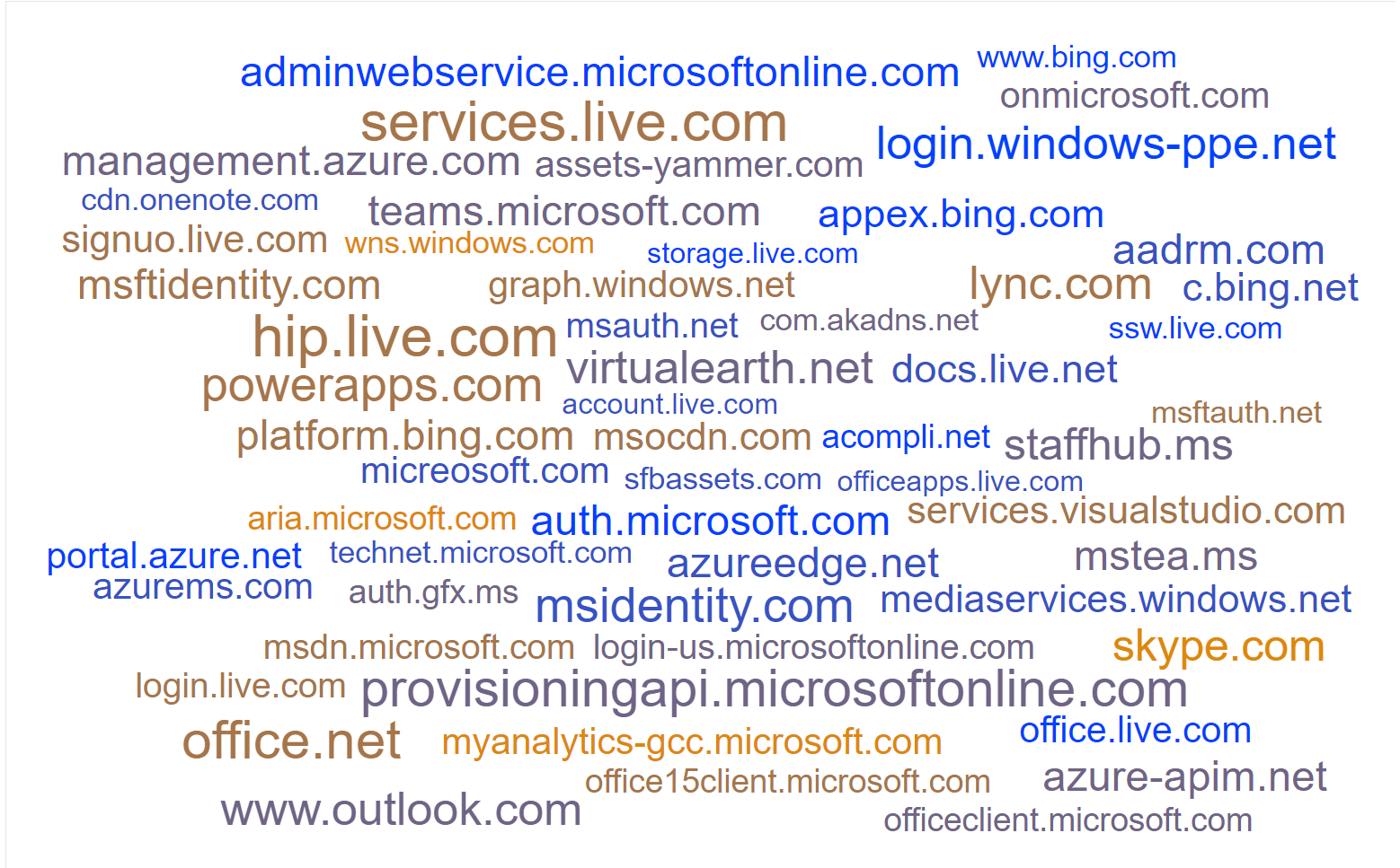 Figure 1: Can you spot the non-Microsoft-approved URL in this cloud? Trick question! They’re all approved. (Source: Microsoft Office 365 URLs and IP address ranges)