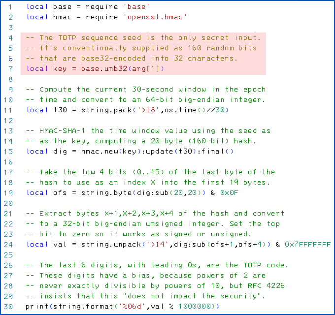 Lua code showing how a TOTP code (time-based one-time password) is generated from a 160-bit sequence seed.