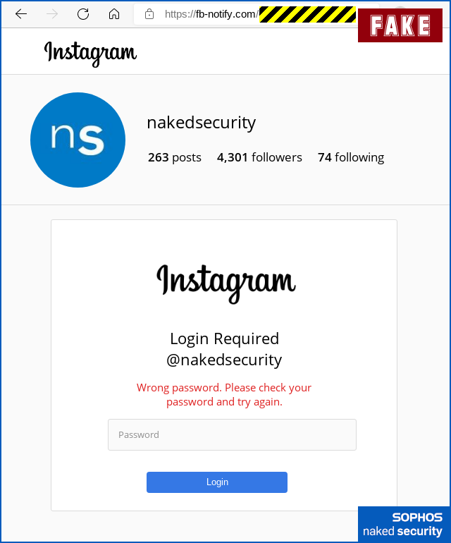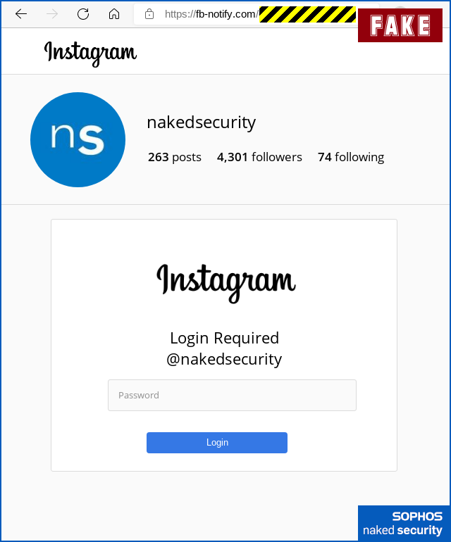 instagram.comorfacebook.com, which is almost certainly what you would expect. We hope you wouldn’t click through in the first place (see point 1), but if you do visit the site by mistake, don’t be in a hurry to go further. A few seconds to stop and double-check the site details would be time well spent. - Use a password manager and 2FA whenever you can. Password managers help to prevent you putting the right password into the wrong site, because they can’t suggest a password for a site they’ve never seen before. And 2FA (those one-time codes you use together with a password) make things harder for the crooks, because your password alone is no longer enough to give them access to your account.