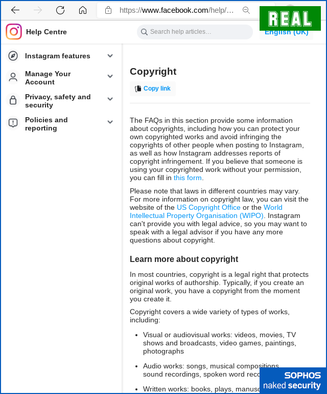 Finally, the criminals sneakily redirect you to the real Instagram copyright page that we listed above, presumably to add an air of legitimacy that leaves you on a genuine website: