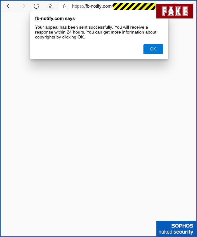 Here, the crooks have registered the fake-but-not-too-far-off domain name fb-notify DOT com, and the link you’re given takes you to a personalised scam page that explicitly references your account: