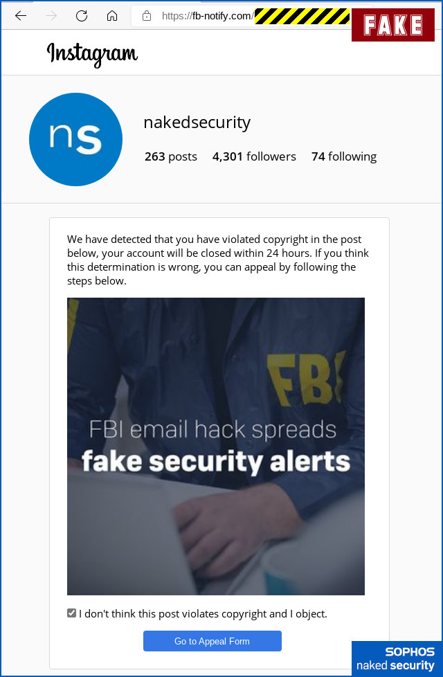 In other pages linked to by these scammers, the image ripped off by the crooks always seemed to be scraped from the second-to-last post on the victim’s Instagram page. That might have been a coincidence, or it could be a deliberate ploy by the crooks to pick an image recent enough that you’ll remember posting it, but not so recent that the copyright complaint might seem unrealistically quick.