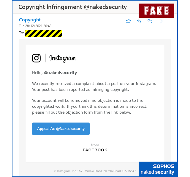 By pretending to be a social network such as Instagram, they try to scare you into thinking that there’s an official copyright complaint against you..