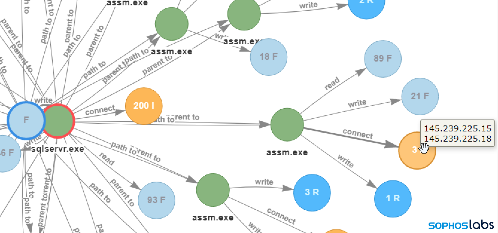 The Mrbminer investigation begins with the Microsoft SQL Server (sqlservr.exe) process launching a file called assm.exe, a downloader Trojan. The assm.exe program downloads the cryptominer payload from a web server, then connects to its command-and-control server to report the successful download and execution of the miner.