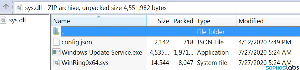 In most cases, the payload was a file named sys.dll, which (despite its file suffix) was not a Windows DLL but a zip archive containing a cryptominer binary, configuration file, and related files.