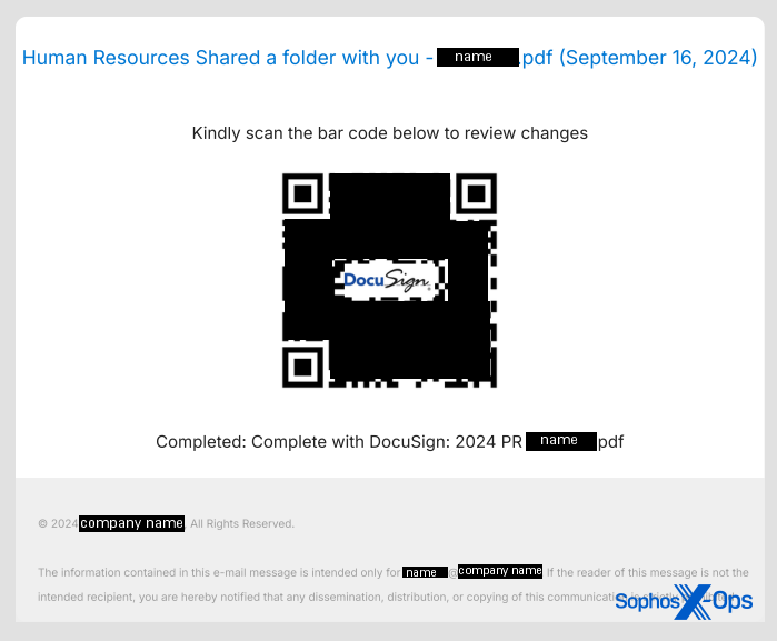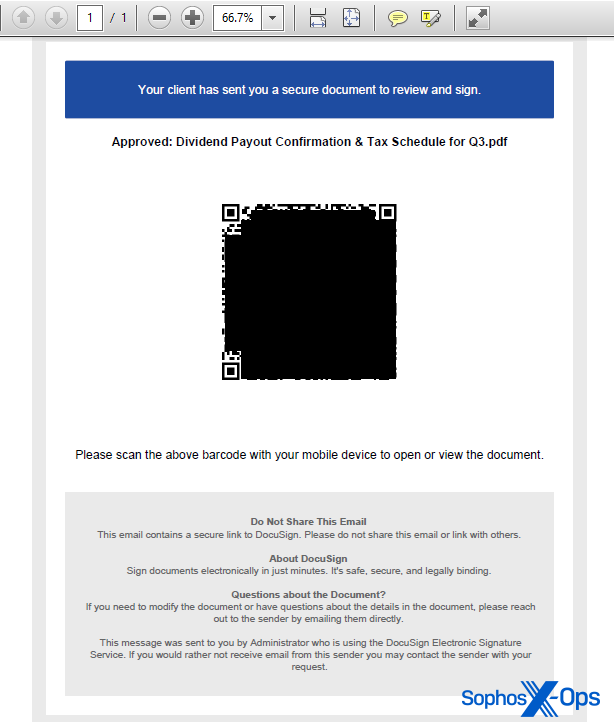 The PDF document contained a Sophos logo, but was otherwise very plain. Text that appears below the QR code states “This document will expire in 24 hours.” It also indicates the QR code points to Docusign, the electronic contract signature platform. These characteristics lend the message a false sense of urgency.
