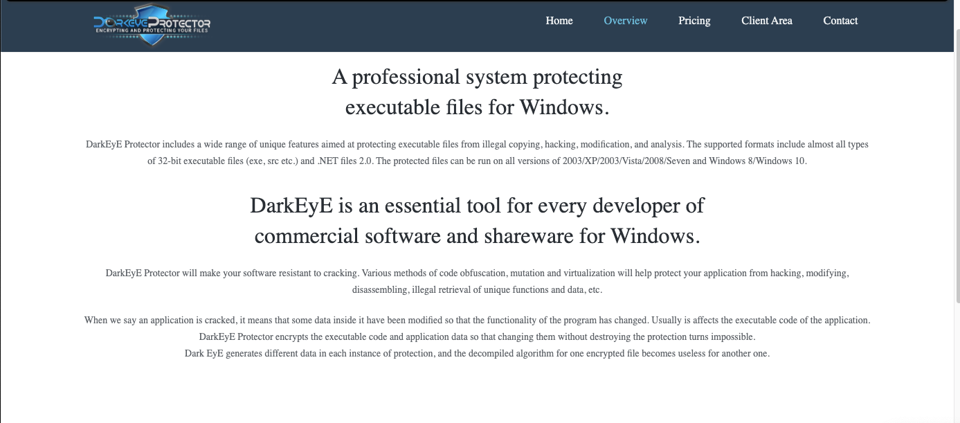 CloudEyE’s developers, Sebastiano Dragna and Ivano Mancini, have been marketing “protector” services for software developers for at least the past five years. Their original product was called DarkEyE Protector, intended to allow developers of commercial or shareware software to enforce software licensing schemes, prevent the copying or reuse of software components, and harden applications against reverse engineering or analysis.