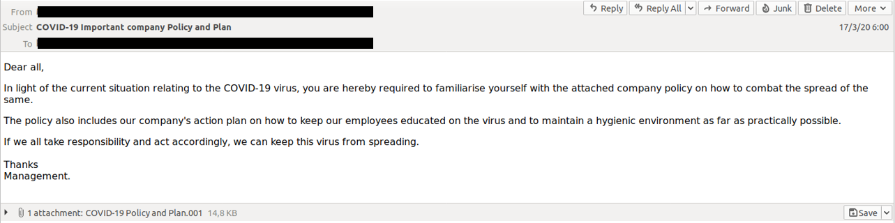 It was also during this period that we saw the RATicate actors begin to use the COVID-19 pandemic as a hook to get victims to open the installers. An email campaign attempting to distribute the Lokibot password-stealing malware used a message attempting to spoof company emails on COVID-19 response policy as a lure to get targeted users to open the malicious attachment: