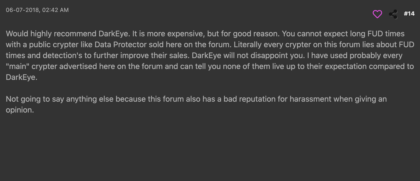 Unfortunately, it was also usable as a malware “crypter”—and RAT operators generally praised its use as a “fully undetectable (FUD) crypter”, even as a subscription service. Various versions of DarkEyE were offered “cracked” on hacker websites and boards as well.
