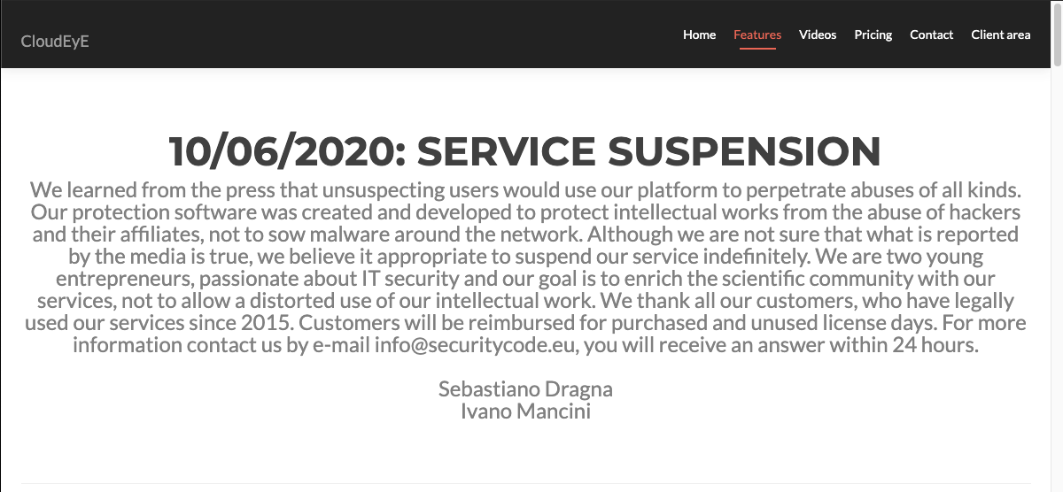 On July 11, CloudEyE resumed operation with the following note from Dragna and Mancini: “Following an internal investigation aimed at verifying abuses carried out with our protection software, we decided to intensify our internal control policies aimed at limiting possible future abuses. Each contribution or report will be analyzed by the staff with the utmost attention and if ascertained, the account will be suspended immediately.”