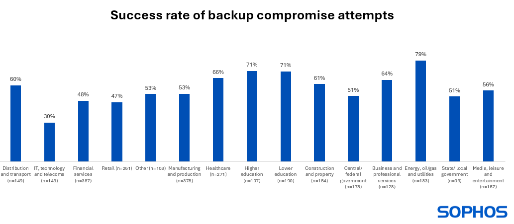 - Conversely, IT, technology and telecoms (30% success rate) and retail (47% success rate) reported the lowest rates of successful backup compromise