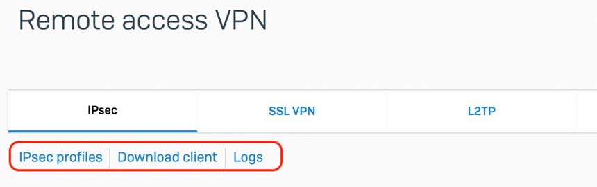 Submenus have been added to IPsec, SSL, and LT2P tabs to provide quick access to settings, client downloads, and the log viewer.