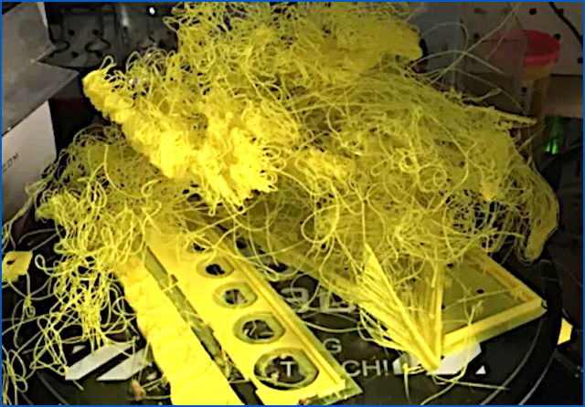 This produces what makerpeople refer to as a spaghetti monster, as this Reddit poster reveals in a plea for help entitled What makes spaghetti happen?, complete with a picture of one that got away: